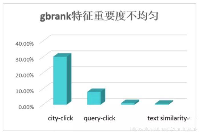 •交叉特征query-click的缺失程度较高,60%的样本该特征值为0。该特征的树节点分裂收益较小,特征无法被选择。然而,事实上,在点击充分的情况下,query-click的点击比city-click更接近用户的真实意图。