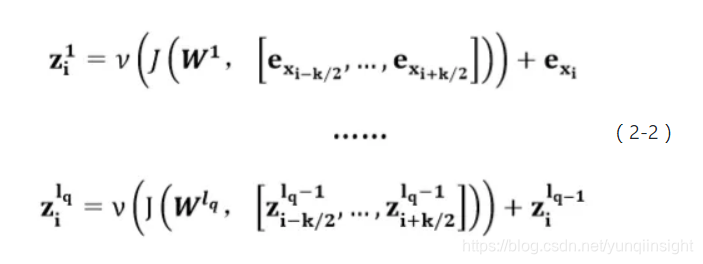 而后我们通过堆叠多层的门控卷积神经网络来扩大其感受野,高层次的门控卷积神经网络可以通过低层次的门控卷积神经网络提取的特征建模距离中心词较远的上下文。同时,为了避免因为网络层数加深而产生梯度消失问题,本文利用残差学习网络(ResidualConnection),将l层输入与l层的输出结合作为l+1层的输入,以保证在反向传播的过程中梯度能稳定的在层级间传播。基于多层门控卷积神经网络的问题编码过程如公式2-2所示: