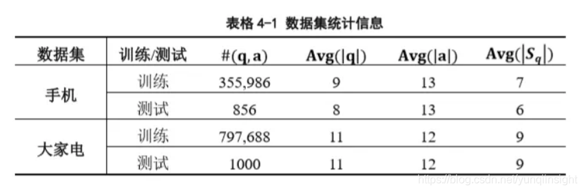 最终得到的数据集统计信息如表4-1所示。表中表示问答对的数量,表示问题的词平均长度,表示标准回答的词平均长度,表示抽取的平均评论片段数目。