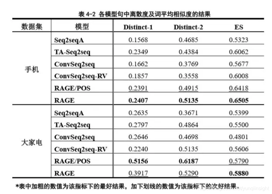 客观评价指标我们采用词平均相似度(Embedding BaseSimilarity;ES)及句中离散度(Distinct)来衡量。主观评价方面,我们规定了如下的打分标准:+3:如果生成的回答既通顺又与问题密切相关,同时包含有效信息且该有效信息与标准回答及用户评论相符,则该回答为3分。+2:如果生成的回答包含与标准回答及用户评论相符的有效信息,但是含有部分的语法错误,比如重复生成、句式紊乱等,则该回答为2分。+1:如果生成回答仅能够用于回答问题,但是不包含有效的信息,比如“我是给别人买的,我不知道”,“可以,可以”等无意义的回答,则该回答为1分。0:如果生成的回答毫无意义或者包含太多的语法错误以至于难以理解,则该回答为0分。而后邀请两位评价者对模型的生成回答进行评价,并利用kappa值衡量评价者间的评价一致性。