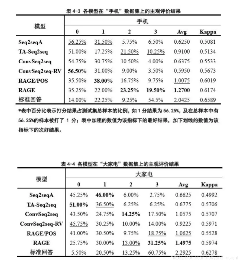 我们对各模型进行了客观指标的评价,,并得到了如表4-2的结果。通过对两个指标的观察我们发现,“大家电”数据集的词平均相似度整体低于“手机”数据集,其原因可能是由于“大家电”数据集类目复杂,句式较为离散,模型不易学习其问答间的转换关系。另外“大家电”数据集中RAGE/POS的句中离散度高于RAGE模型,通过结合主观评价指标的综合分析,我们认为其可能的原因是RAGE/POS生成了部分不相关的词,导致其句中离散度较高。同时我们观察到,TA-Seq2seq和ConvSeq2seq-RV以及RAGE/POS、RAGE的句中离散度和词平均相关性在两个数据集上均高于Seq2seqA和ConvSeq2seq,佐证了本文“引入外部信息有利于生成包含有效信息以及贴合问题语义的回答”的观点。