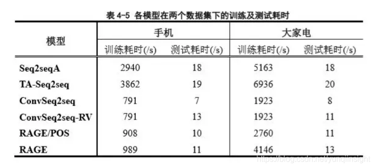 考虑到电商领域实时响应的需求,我们在基础模型的搭建过程中,将以往工作中常用的循环神经网络替换为多层门控卷积神经网络,为证明其效率,我们在单卡 Tesla K40 GPU环境下对比了各个模型的训练及测试效率,其结果如表4-5中所示,可以观察到,基于循环神经网络的Seq2seqA和TA-Seq2seq模型,训练及测试的耗时明显高于基于多层卷积神经网络的其他模型。