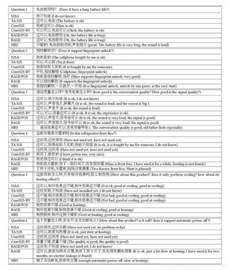 最后我们做了Case Study。于表4-6中列出其标准回答,评论抽取过程中Word Mover’s Distance最小的评论片段MSR,以及各个模型的生成结果。通过表中案例可以观察到,对于问题1,2,4这类简单的问题,各个模型生成的回答都相对贴合问题语义。Seq2seqA以及ConvSeq2seq这两个模型由于没有引入外部信息,其生成的回答明显不具备任何有效信息,是所有问题都适用的安全性回答。RAGE得利于其对评论片段的抗噪表示以及融合方式,生成的回答相比于其他模型更加准确、通顺、符合语法且包含丰富的有效信息。