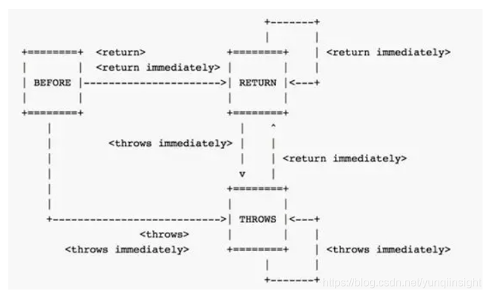 BEFORE、RETURN 和 THROWS 三个环节事件的正常流转和干预流转。