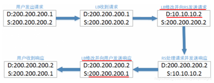 - 请求包到达lvs,lvs修改请求包为(sip 200.200.200.1, dip rip) 注意这里sip/dip都被修改了