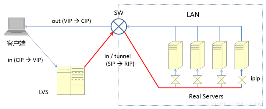 - LVS和RS上的tunl0虚拟网卡上配置同一个VIP(类似DR)