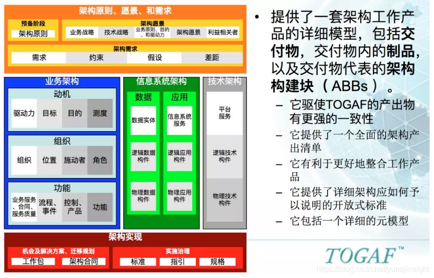 TOGAF 强调商业目标作为架构的驱动力,并提供了一个最佳实践的储藏库,其中包括 TOGAF 架构开发方法(ADM)、TOGAF 架构内容框架、TOGAF 参考模型、架构开发方法(ADM)指引和技术、企业连续统一体和 TOGAF 能力框架。