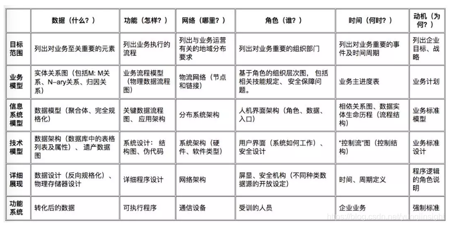 Zachman 框架模型分两个维度:横向维度采用6W(what、how、where、who、when、why)进行组织,纵向维度反映了 IT 架构层次,从上到下(Top-Down),分别为范围模型、企业模型、系统模型、技术模型、详细模型、功能模型。横向结合6W,Zachman 框架分别由数据、功能、网络、人员、时间、动机分别对应回答What、How、Where、Who、When 与 Why 这六个问题。