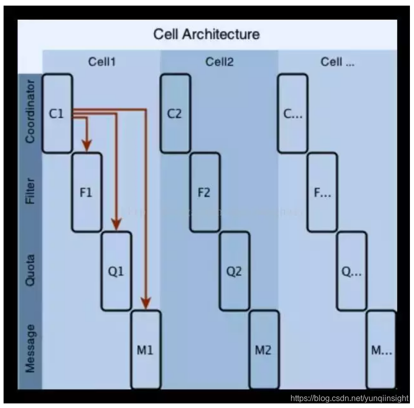 在单元化架构下,服务虽然分层划分,但每个单元自成一体。按照层次来讲的话,所有层使用相同的分区算法,每一层都有相同数量的节点,上层节点也会访问指定的下层节点。