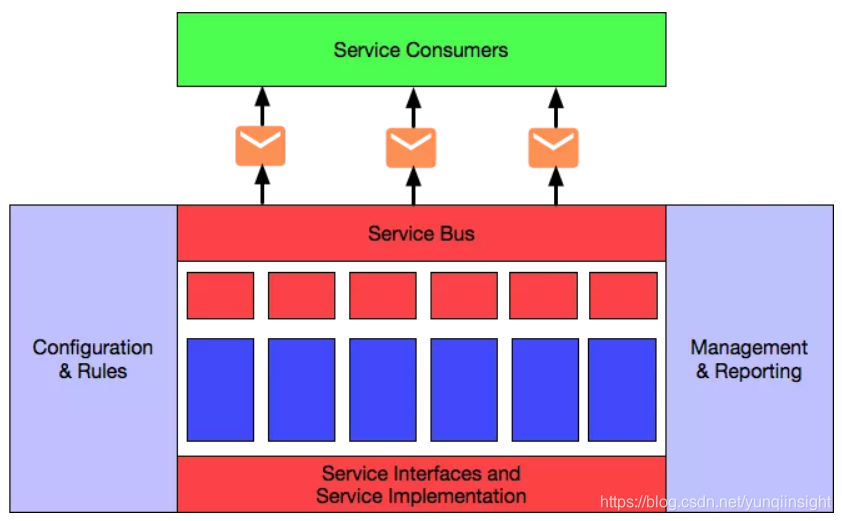在上图中, 服务消费者(service consumer)可以通过发送消息来调用服务。这些消息由一个服务总线(service bus)转换后发送给适当的服务实现。这种服务架构可以提供一个业务规则引(business rules engine),该引擎容许业务规则被合并在一个服务里或多个服务里。这种架构也提供了一个服务管理基础(service management infrastructure),用来管理服务,类似审核,列表(billing),日志等功能。此外,该架构给企业提供了灵活的业务流程,更好地处理控制请求(regulatory requirement),例如Sarbanes Oxley(SOX),并且可以在不影响其他服务的情况下更改某项服务。