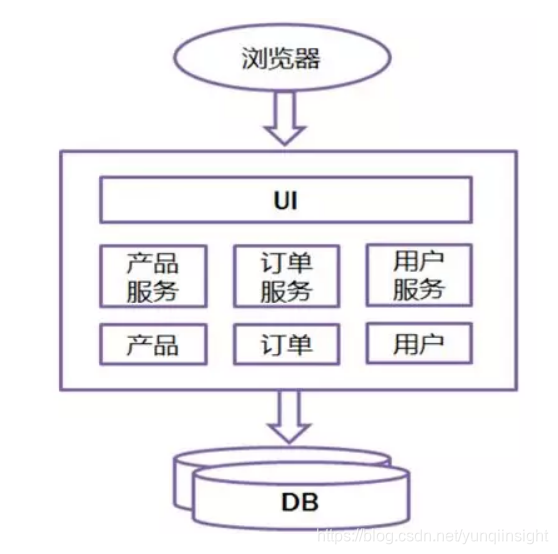 所有的功能打包在一个 WAR包里,基本没有外部依赖(除了容器),部署在一个JEE容器(Tomcat,JBoss,WebLogic)里,包含了 DO/DAO,Service,UI 等所有逻辑。