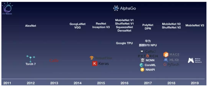 人工智能从 2006 年开始,迎来了第三次浪潮。随着 AlphaGo 在 2016 年、 2017 年先后战胜李世石和柯洁,人工智能彻底进入了公众的视野。人工智能大热的背后,是大数据的积累,是深度学习的发展,也是设备算力的提升。与此同时,深度学习的框架也在不断演进 —— 从 Torch、Caffe 到 TensorFlow、PyTorch ,再到更面向移动端的 CoreML、NNAPI、NCNN、MACE 等。淘宝的深度学习推理引擎 MNN 也于 2019 年 5 月宣布开源。