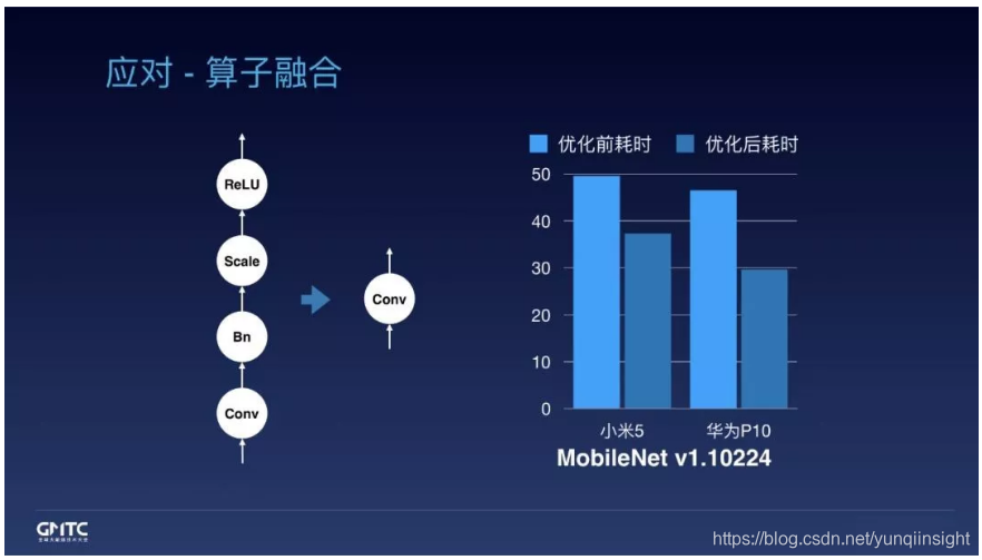 这样,四个算子就可以合并成一个算子。融合的过程避免了三次 tensor 读写、两次 tensor 乘加。优化效果:MobileNet V1 在小米 5 和华为 P10 上有 20 ~ 40% 的性能提升,效果还是比较明显的。