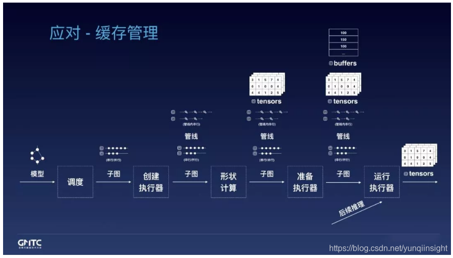 在创建完执行器之后,子图和管线已经就绪。下来,需要计算出所有 tensor 的形状,在相应的后端上完成内存的分配。而后,在准备执行器时,再为所有的执行器预先在后端上申请好必要的 buffer。运行结束后,返回 tensor 即可。