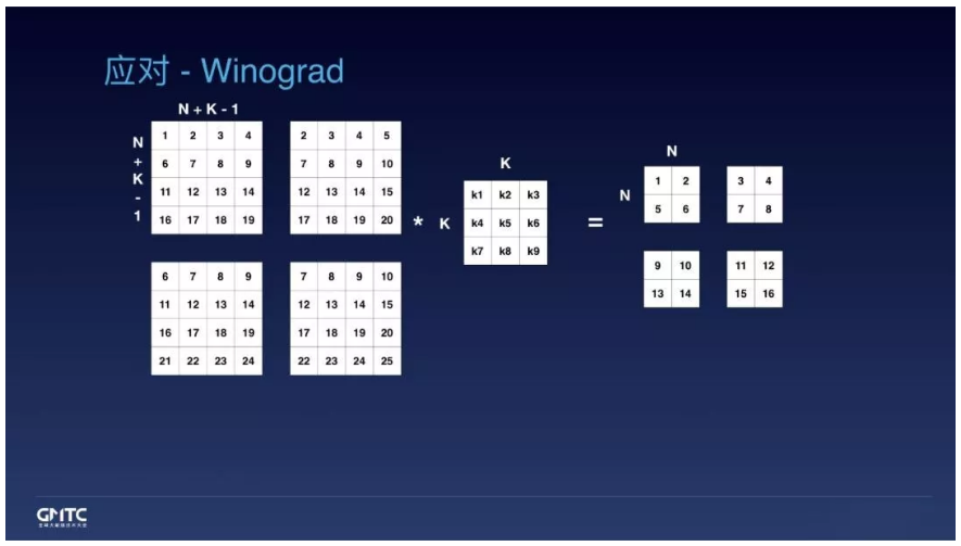 这样,原来矩阵卷积所需要的 9x4 次乘法计算就可以用矩阵点乘的 4x4 次乘法计算代替。只考虑乘法耗时的话,加速了 2.25 倍。示例中, K=3,N=2 ,但实际使用时,可以选择更大的 N 值,获取高的加速倍数,但也要相应消耗更多的内存。