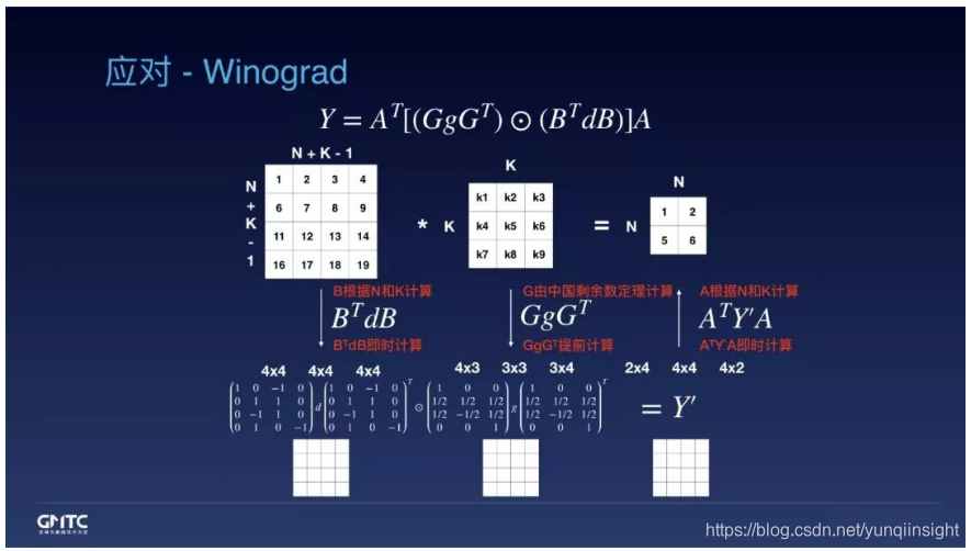 再套用 Winograd 的公式,将矩阵间的卷积运算转换为矩阵点乘运算。在这个过程中,除了矩阵点乘外,还引入三个矩阵转换,分别是输入矩阵 d 、权重矩阵 g 和结果矩阵 Y’ 的转换。其中,权重转换时, G 矩阵可以利用中国剩余数定理计算, GgGT 就可以在准备执行器时提前计算;输入转换和输出转换时用到的 A 和 B 矩阵需要根据 N 和 K 计算,我们在代码中内置了几种优化后的组合,所以实际计算时,这两个转换并不需要经过复杂的矩阵乘法。