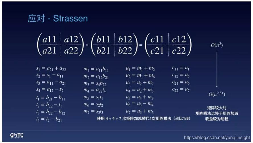 这里可以引入中间小矩阵, s1 ~ s4、t1 ~ t4、m1 ~ m7、u1 ~ u7 。其中,只有 m1 ~ m7 包含小矩阵乘法,一共 7 次小矩阵乘法运算。而其他的,只包含小矩阵的加减法。也就是说,通过 4 + 4 + 7 次小矩阵加减法,替代了一次小矩阵乘法。
