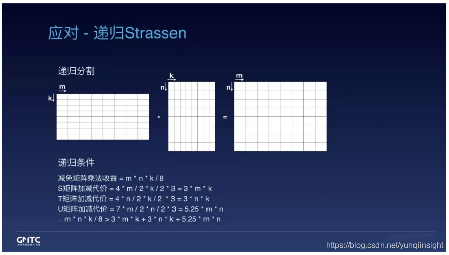 在 MNN 中,我们会递归使用 Strassen 。也就是说,递归拆分矩阵。在矩阵足够大时,继续拆分;在矩阵不够大时,使用普通的矩阵算法。这里使用减免的矩阵乘法开销作为收益,使用小矩阵 s 、小矩阵 t 、小矩阵 u 矩阵的加减法开销之和作为代价,收益大于代价时,就可以考虑使用 Strassen 算法。