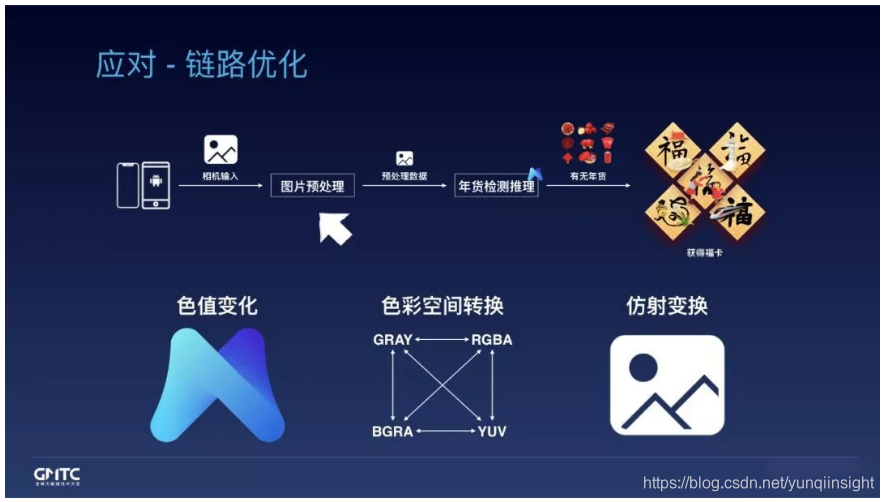 链路优化可以举一个 19 年春节淘宝扫年货的例子。在获得手机相机输入后,每一帧的图像首先需要经过一次预处理,将图片缩放到年货检测模型的输入大小上,然而再经过推理,判定图像有没有年货,如果有,就发放相关权益。这个过程中,图片预处理的耗时也不容忽视。降低这个耗时,就可以帮助我们提升帧率,从而改进用户体验。为此,我们引入了一个轻量级的 2D 图片处理库,可以高效地完成色值变化、色彩空间的转换或者仿射变换等。这样, MNN 的用户就不再需要为图片处理引入 libyuv 或者 opencv 了。