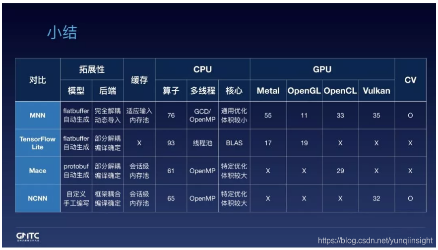 目前, MNN 在 CPU 上实现了 76 个算子, Metal 上有 55 个, OpenGL 覆盖了基础的 CNN 网络, OpenCL 和 Vulkan 分别有 29 和 31 个。