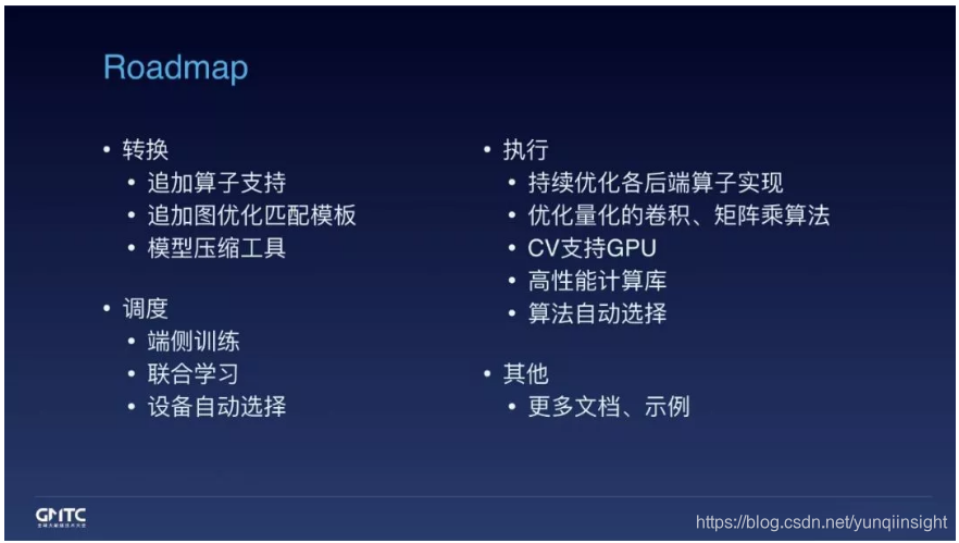 在后续计划上,转换部分,我们计划追加更多算子和更多图优化匹配模板,也计划将模型量化工具开源;调度部分,我们计划分步实现端侧训练和边缘学习,计算设备自动选择也在筹划中;执行部分,还是会持续优化现有各端算子的实现,也计划优化量化卷积、矩阵乘算法,计划在 CV 库上直接支持 GPU ,我们也考虑将现有 NC/4HW4 实现的算法,整理为独立的高性能计算库,算法自动选择同样在筹划中;其他部分,我们会持续建设项目的可用性,持续加入更多的文档和示例。