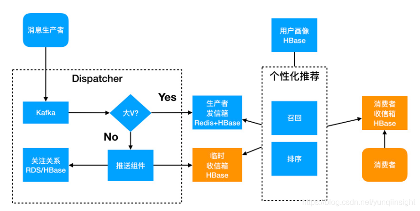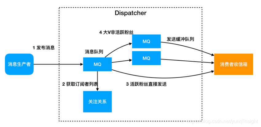 - 异步化。生产者提交消息首先写入一个队列,成功则表示发布成功,Dispatcher模块会异步的处理消息。这一点非常关键,首先生产者的消息发布体验非常好,不需要等待消息同步到粉丝的收信箱,发布延迟低成功率高;其次Dispatcher可以控制队列的处理速度,可以有效的控制大V账号造成的脉冲压力。