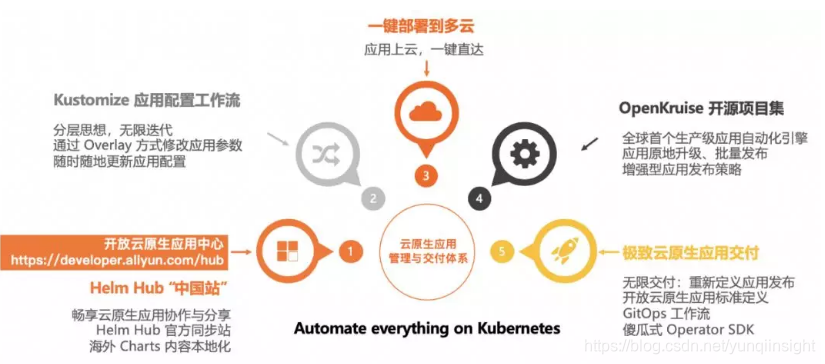 整个云原生应用管理与交付体系包含五大项目,本次 KubeCon 两大项目率先亮相:国内首个开放云原生应用中心—— Cloud Native App Hub 和云原生应用自动化引擎—— OpenKruise。