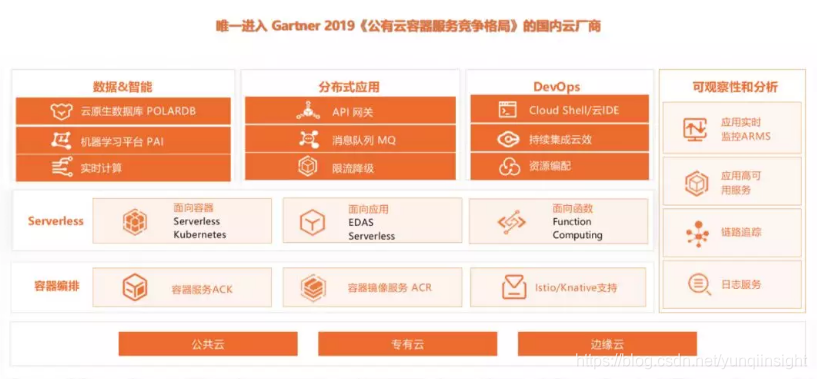 阿里巴巴 All in Cloud,沉淀并实现了云原生能力全面升级。更值得一提的是,阿里云拥有业界领先的云原生能力技术栈,是国内唯一进入 2019 年 Gartner《公有云容器服务竞争格局》的企业。