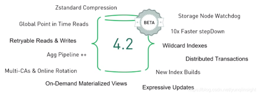 MongoDB 4.2 在查询语言的表达能力上进一步增强,update、aggregation、index 等方面都有巨大的提升,具体细节等 4.2 正式版文档发出可以详细了解。