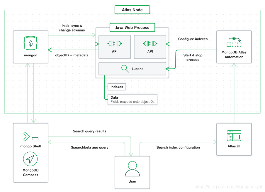 - 对于开启全文建索的集合,新写入到 MongoDB 的数据, 后台的服务会通过 Change Stream 的方式订阅,并更新到 Lucene 索引引擎里。