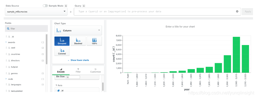 Charts 在使用上还是有一定学习成本的,不是特别直观,需要配合教程,了解下运作原理,才能得到想要的图,比如这个例子里,针对电影集合,Released 的年份做了聚合分析,得到分布图。