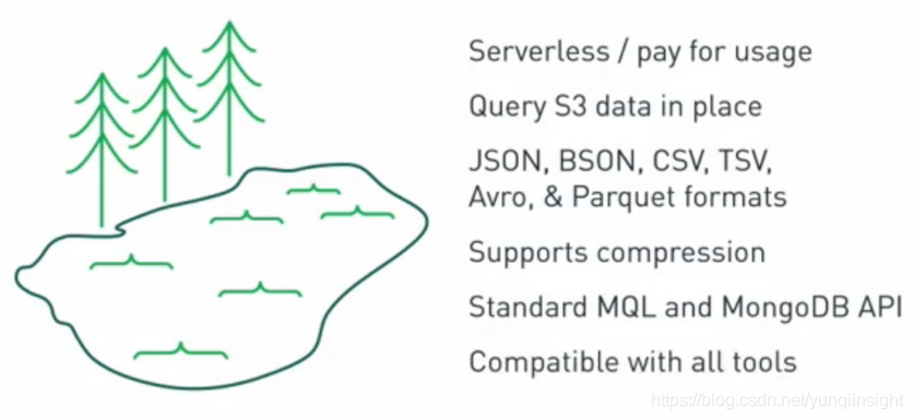 在新版本 Atlas 服务里,提供了 Atlas Data Lake,能直接通过 MongoDB API 访问存储在 AWS S3 (未来支持 Azure、Google 的存储服务)里的数据。