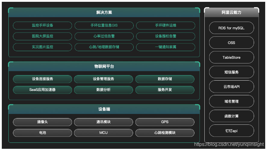 我们首先构建一个可以拍照,检测心跳的手环设备,然后基于这个设备帮助护理机构开发一个集合管理监控告警的SaaS系统。设备由一个可以检测心跳的光学模块,一个可以检测老人所在地场景的摄像头,一个GPS定位模块,一个物联网通讯模块(一般为GPRS),MCU和电源组成。云端由物联网平台为基础建立设备与云端通讯,配合RDS存储心跳&GPS数据,OSS存储图片数据,最后用IoT Studio的服务开发与Web可视化开发功能完成功能页面搭建。整个云端开发过程只需要2小时以内即可。