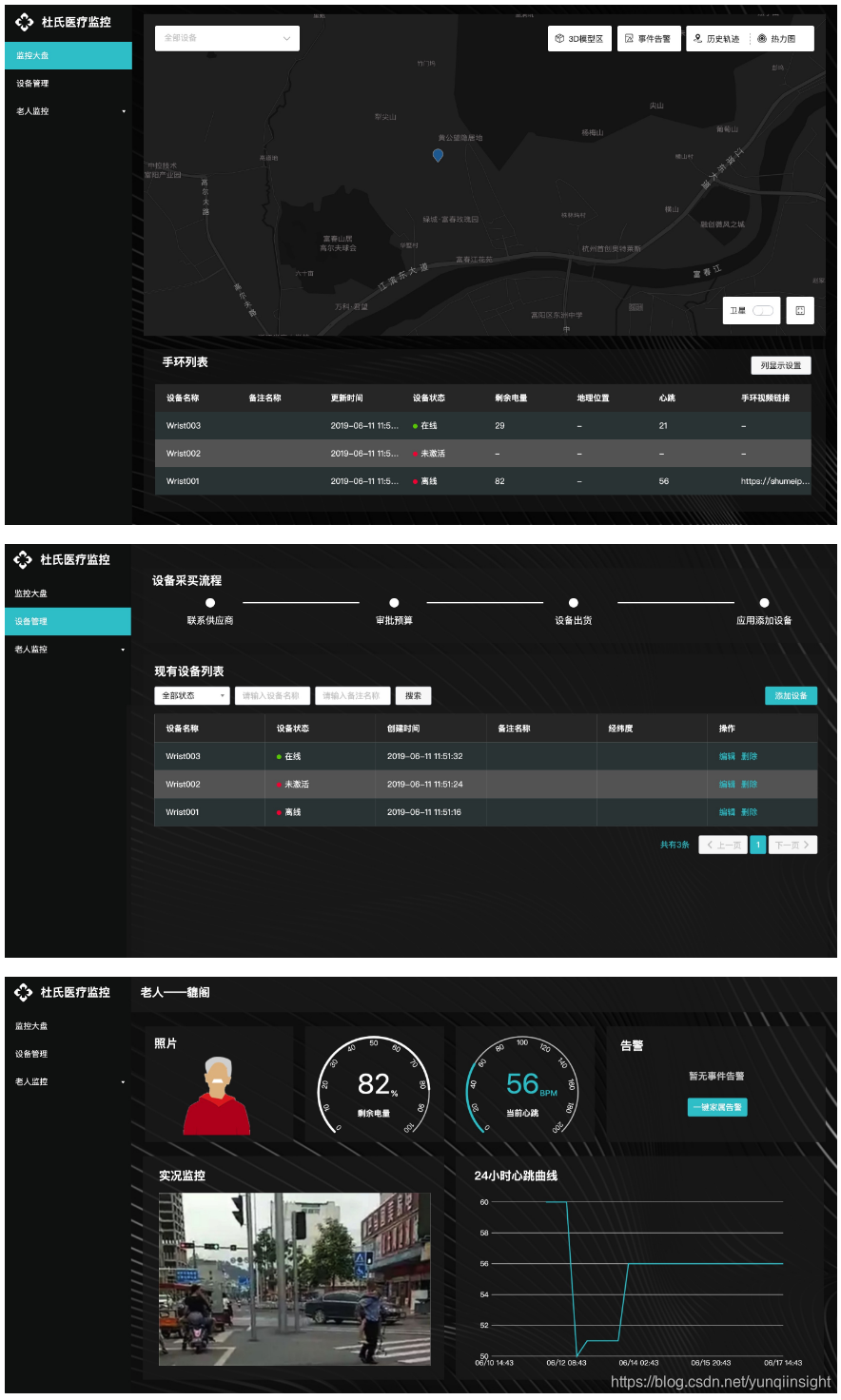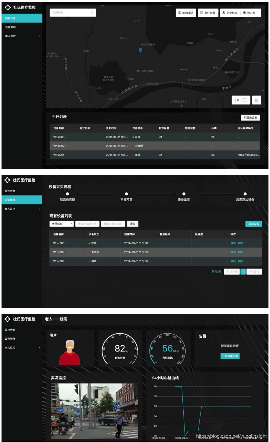 本次的应用部分包括设备管理的页面,允许医院维护人员查看各个设备的状态,属性并根据需求添加新的设备。另外有当前所有设备在地图上的分布情况,方便监控老人动向。最后包含了一个监控手环上报图片的实时查看功能,可以查看老人有没有遇到危险,迷路等。