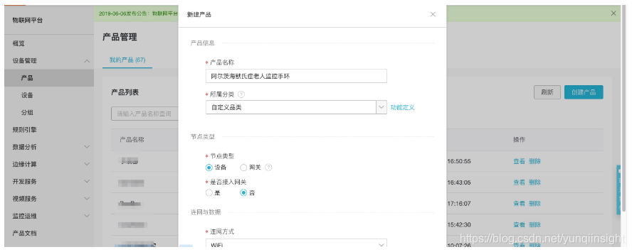 进入阿里云物联网平台,在产品页面新建一个产品,选择自定义品类即可,命名为“阿尔茨海默氏症老人监控手环”。