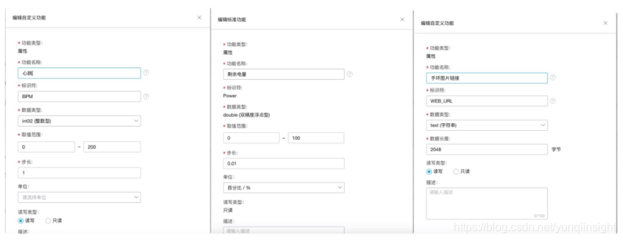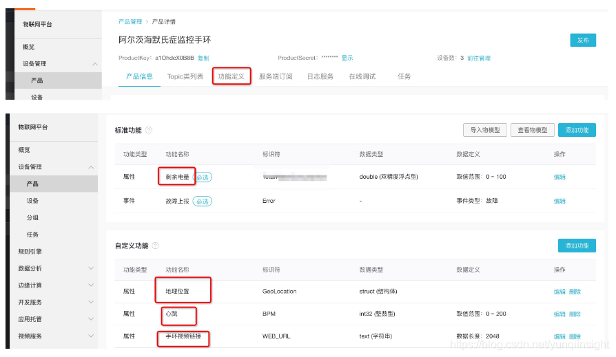 进入产品的功能定义页,定义5个自定义功能——剩余电量,地理位置,心跳,图片地址(存放摄像机上传图片的URL)。