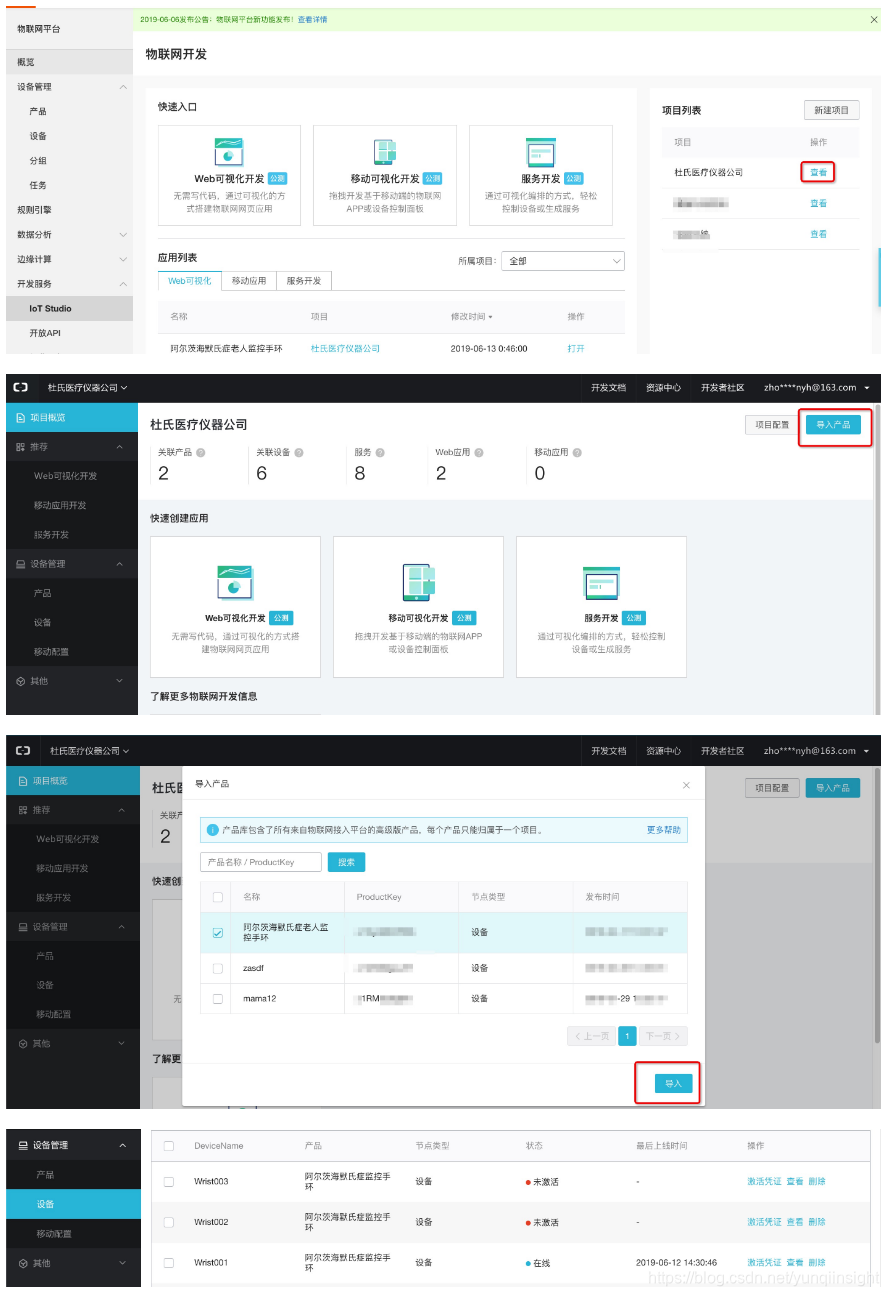 首先打开物联网平台的“开发服务”选项进入IoT Studio。点击某个项目名称的“查看”进入项目详情页。然后点击右上角的“导入产品”。选择刚才的手环产品,然后导入,可以在设备管理页看到产品以及下属的设备已经导入项目里。