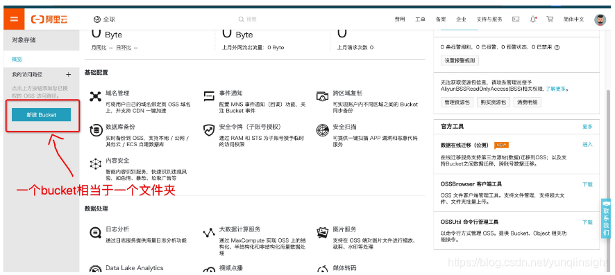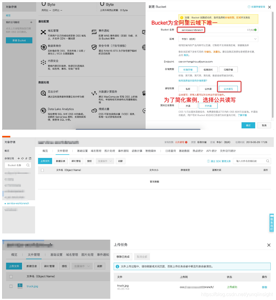 然后可以看到OSS控制台新建了一个bucket,里面是空的,我们可以尝试上传一些图片。