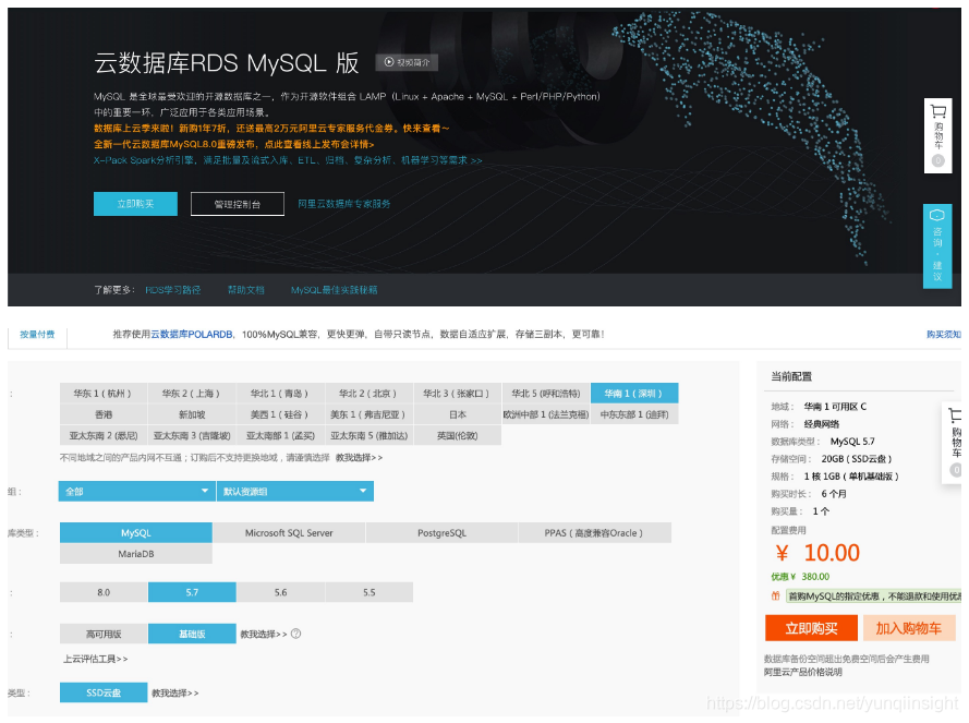 阿里云关系型数据库RDS(Relational Database Service)是一种稳定可靠、可弹性伸缩的在线数据库服务,提供容灾、备份、恢复、迁移等方面的全套解决方案,彻底解决数据库运维的烦恼。目前六月份有10块钱试用半年的折扣,可以尝试购买。