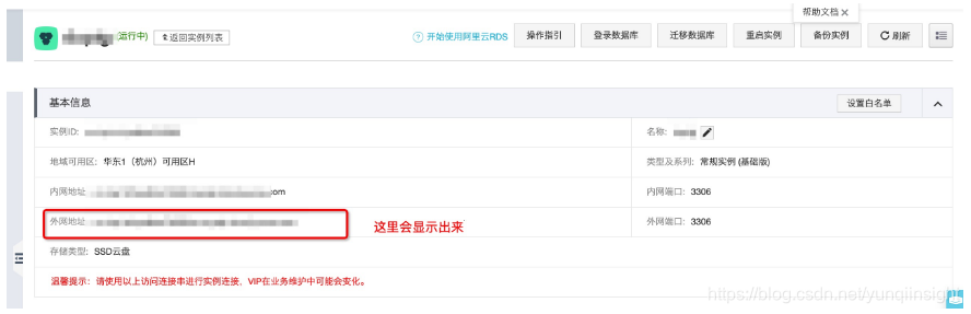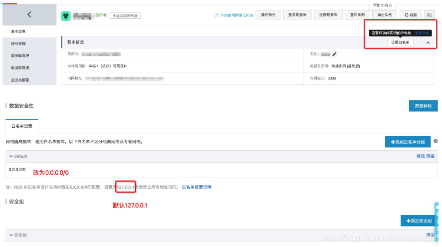 由于我们需要用外部的服务调用RDS数据录入,因此需要允许外网访问,需要首先设置白名单。然后把默认的127.0.0.1改为0.0.0.0/0