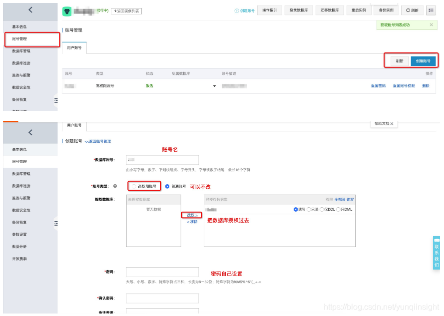 接下来需要设置登录数据库的账号,进入账号管理页点击创建账号,输入账号密码等信息,并且选择要授权的数据库。
