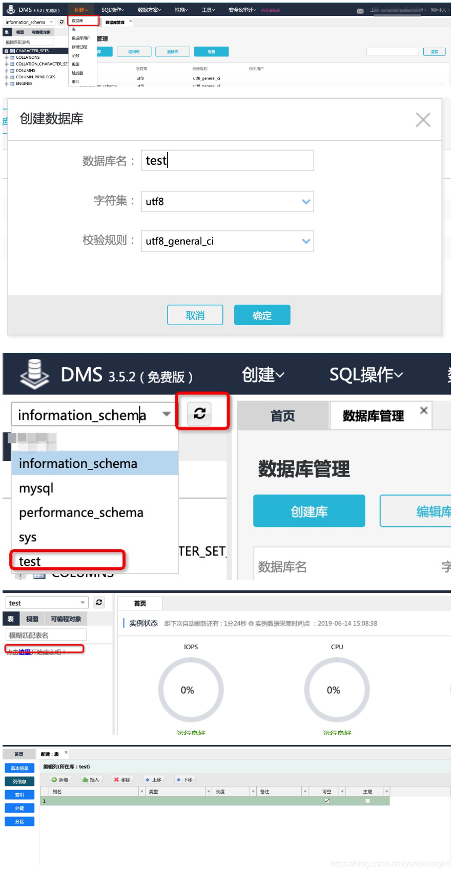 登录之后首先创建一个数据库,命名为test,然后刷新一下,可以看到新建的test数据库,然后进入数据库建立一张表。