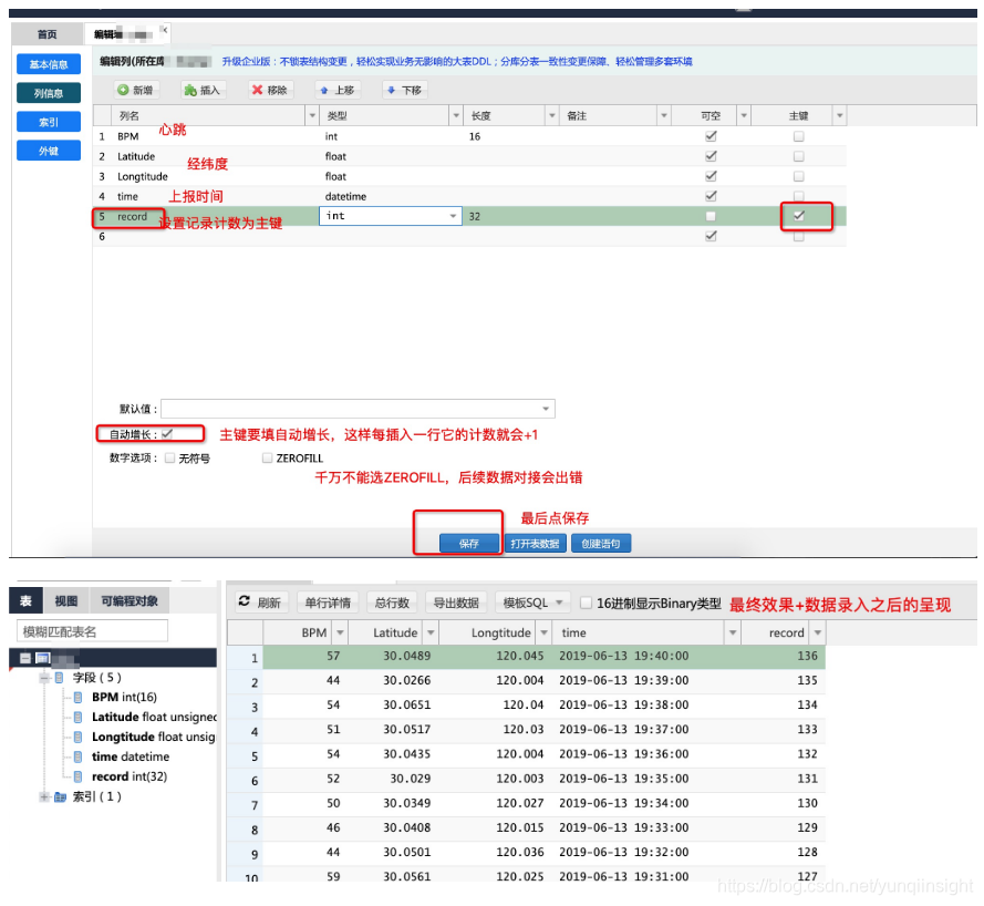 插入如下的几列,注意time可能需要改为timestamp类型,最后保存即可完成。这样就完成了表结构的配置。