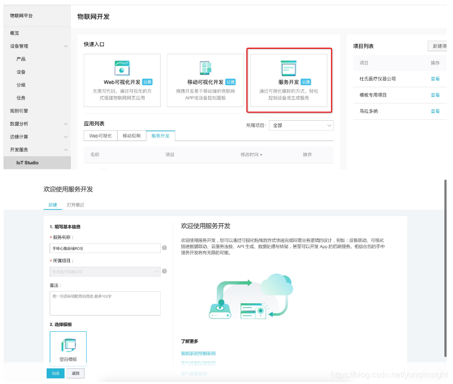 首先在物联网平台首页,开发服务下的IoT Studio的快速入口进入服务开发工作台。然后新建一个服务,命名为“手环心跳转储RDS”。