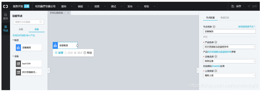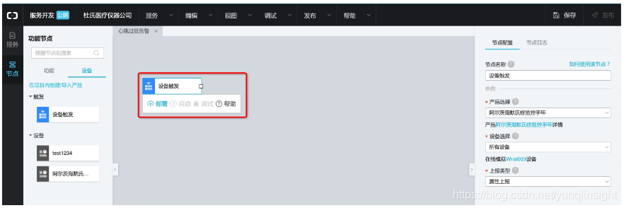 然后在节点列表里选择“设备触发”节点,在右侧栏选择之前创建的产品“阿尔茨海默氏症监控手环”,监听所有设备的属性上报,如图。
