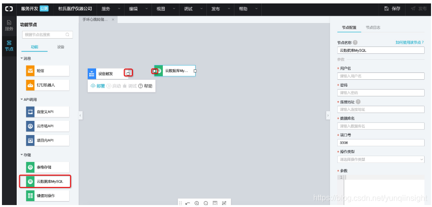 接下来选择一个云数据库mySQL节点,将设备触发节点与云数据库节点连接起来。