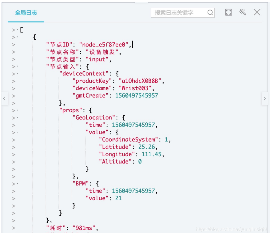 {"deviceContext": {"productKey": "a1OhdcX0B8B","deviceName": "Wrist003","gmtCreate": 1560497545957},"props": {"GeoLocation": {"time": 1560497545957,"value": {"CoordinateSystem": 1,"Latitude": 25.26,"Longitude": 111.45,"Altitude": 0}},"BPM": {"time": 1560497545957,"value": 21}}}