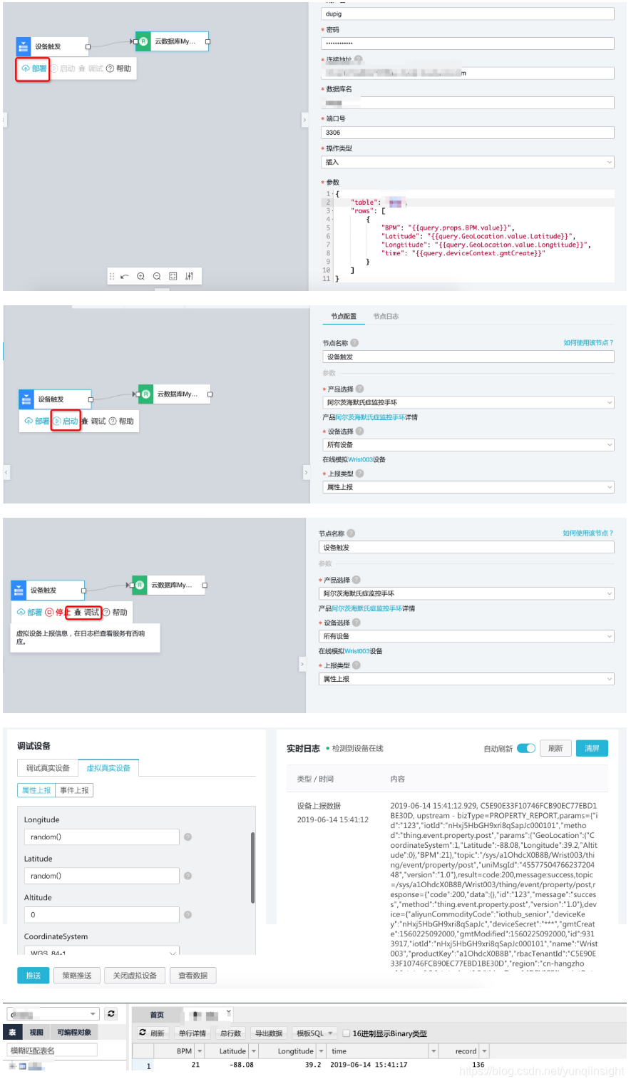 完成后点击部署,调试(可以使用虚拟设备上报),回到RDS的数据库页面,可以看到数据更新了。这样就完成设备数据上报转RDS的操作。
