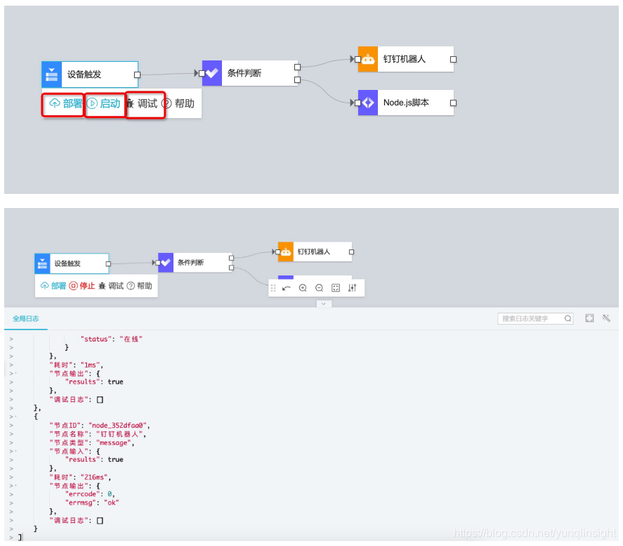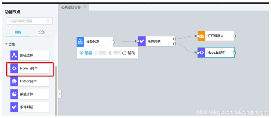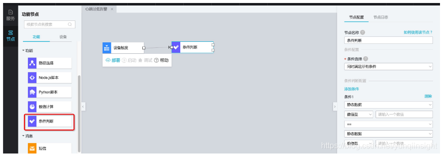 添加一个“条件判断”节点,条件节点相当于一个if-else判断。并且把设备触发节点与条件节点连接起来。