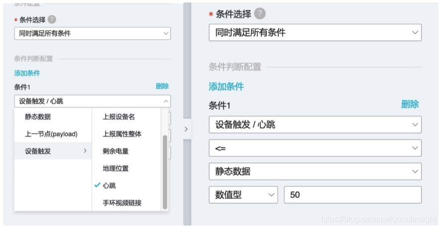 在条件判断节点中,第一个选择“同时满足所有条件”,在“条件1”中第一个下拉框选择“设备触发”,在二级菜单选择“心跳”;判断条件选择“<=”,第二个框选择“静态值”“数值”。触发报警的条件我们设置为老人心跳值小于50。